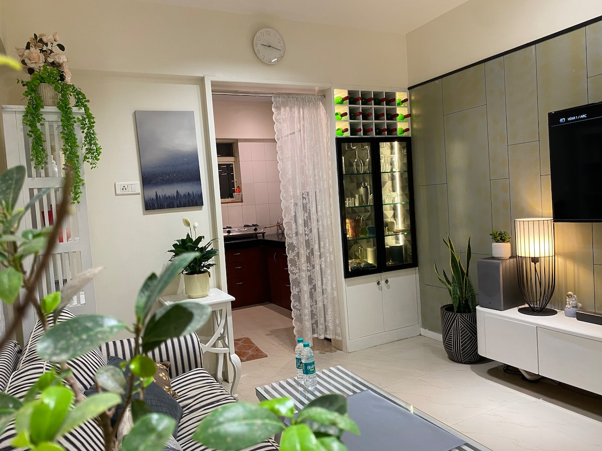 Bem-vindo ao nosso refúgio luxuosamente refinado e confortável, elegantemente projetado com Adobe de tema branco puro, com projetor, a poucos minutos do Aeroporto Internacional de Pune. Situado em uma localização privilegiada perto da Symbiosis College, Viman Nagar, Kalyani Nagar, Koregaon Park, nossa estadia é ideal para viajantes de negócios, exploradores individuais e casais. Se você está pegando um voo, desfrutando da cidade, você vai se sentir em casa, interiores brancos elegantes, ambiente sereno e artístico, Wi-Fi de alta velocidade, varanda privada