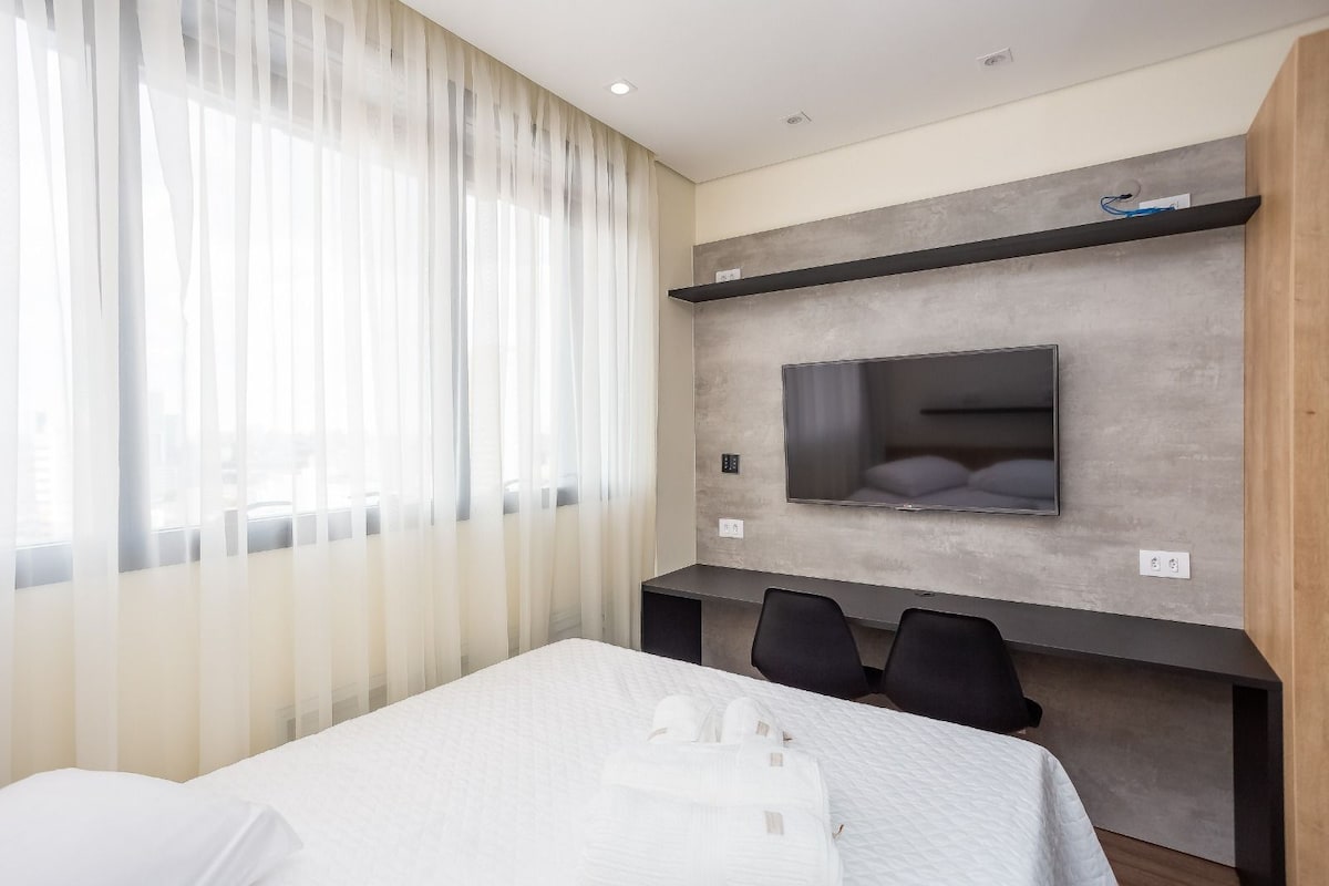 Studio moderno, novíssimo, aconchegante, perfeita localização, com uma linda vista da sacada, principalmente a noite . Wi-Fi rápido, mesa de trabalho, TV smart 55” , cama Queen. Ar condicionado (quente/frio). Máquina de lavar e secar roupa e uma linda ilha na cozinha. 50m2 de muito estilo-27ºandar, Silencioso. No Centro/Batel, próximo à comércios, bancos, shoppings, polo gastronômico e Hospital . No prédio :Piscina, academia, sala de jogos, sauna, jacuzzi, portaria 24 horas.