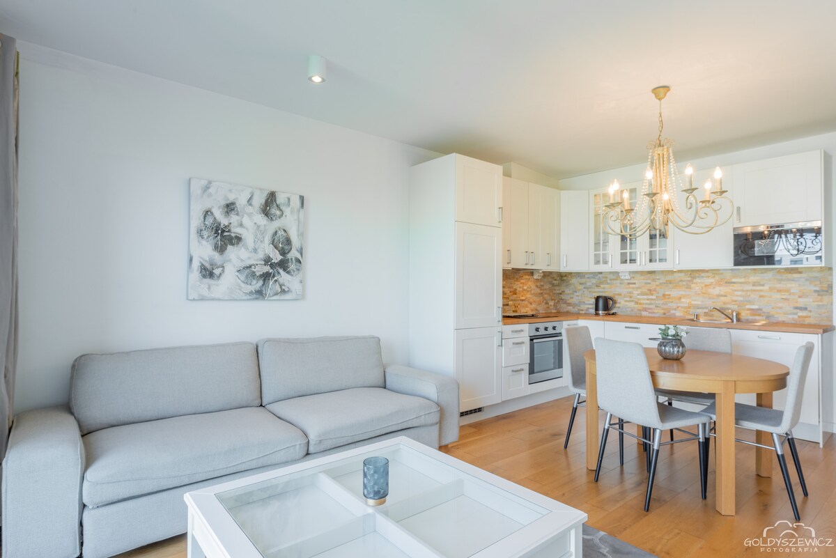 Apartament jest przestronny, urządzony w jasnych, przytulnych tonach, nawiązujących do nadmorskiego klimatu. Na gości czeka dobrze wyposażony aneks kuchenny, idealny do przygotowywania posiłków, strefa wypoczynkowa oraz balkon, na którym można wypić poranną kawę, podziwiając okolicę. Dodatkowo w obiekcie dostępne są udogodnienia, takie jak miejsce parkingowe i bezpłatne Wi-Fi, które sprawiają, że pobyt jest wygodny zarówno dla rodzin z dziećmi, jak i par szukających romantycznego wypoczynku.