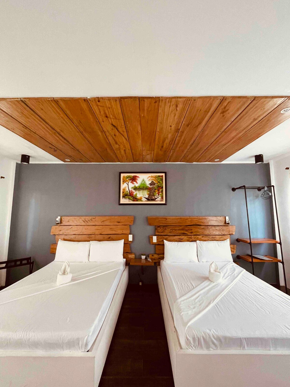 Você ficará no quarto premium de Copacabana, um pequeno hotel boutique no centro do General Luna. Nossos seis quartos elegantes e intimistas oferecem a mistura perfeita de charme estético, itens básicos modernos e serviço atencioso. O quarto premium é perfeito para hóspedes que querem algo mais espaçoso, bem como comodidades adicionais, como um espelho de corpo inteiro, vistas para as árvores vizinhas, bem como o conforto de estar no segundo andar, longe do barulho da estrada.
