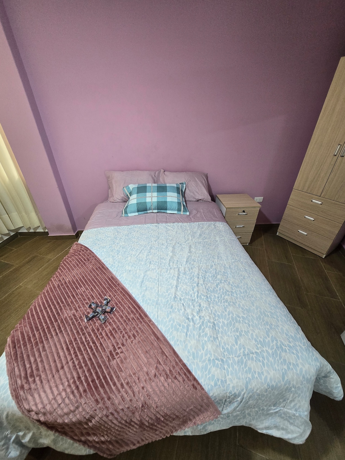 Faça uma pausa e relaxe neste apartamento tranquilo e acolhedor, localizado a 2 quarteirões da praça principal, perto de restaurantes, bancos, centros comerciais, agências de turismo, etc. Seguro e silencioso, tem: TV + Paramount, cozinha, frigobar, água quente, micro-ondas, máquina de lavar roupa, etc. Garagem gratuita, confortável e segura para você e sua família. Possui dois quartos, três camas, um banheiro, cozinha, sala de estar e todo o equipamento necessário para uma estadia agradável.