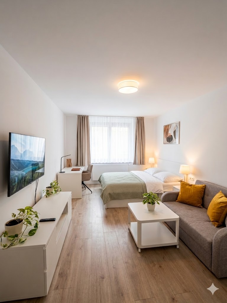 🌿 Estúdio aconchegante na Rezidencia Albelli Desfrute de uma estadia tranquila neste apartamento ESTÚDIO moderno no tranquilo complexo Rezidencia Albelli. Possui mobiliário novo, uma confortável cama queen size (160×200 cm) 🛏️ e ar condicionado❄️. Relaxe na varanda com sofá ao ar livre, desfrute de estacionamento gratuito, jardim privativo e mercearia no local🛒. A rua principal fica a apenas 12 minutos a pé. Para maior conforto, o apartamento também inclui persianas e uma rede mosquiteira☀️🦟.