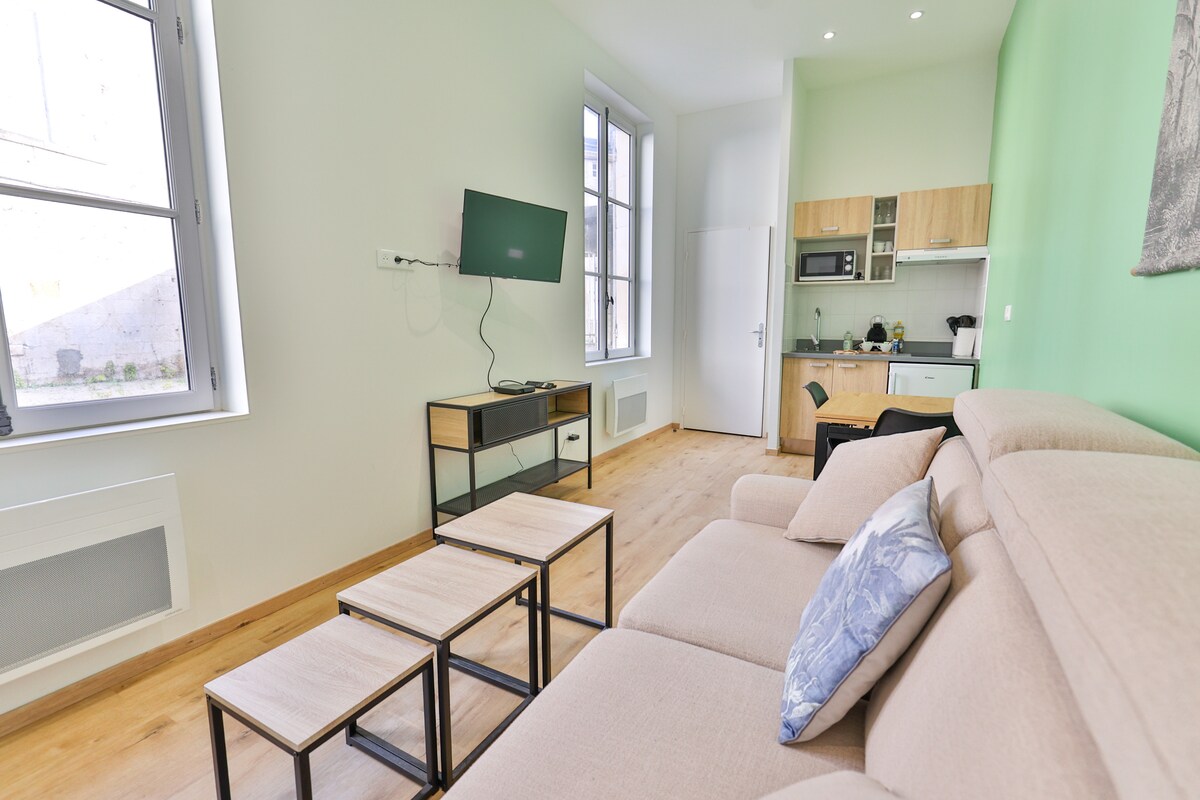 Ideally located just 200m from Place François 1er, the iconic heart of Cognac, this studio combines elegance and comfort. The sleeping area features a 160x200 bed with a high-quality mattress for a restful night's sleep. The living space, with its sleek and refined design, includes a dining area and a functional kitchen, creating a warm and inviting atmosphere. Free parking is available on the street at the foot of the building. A perfect setting to fully enjoy your stay in Cognac.