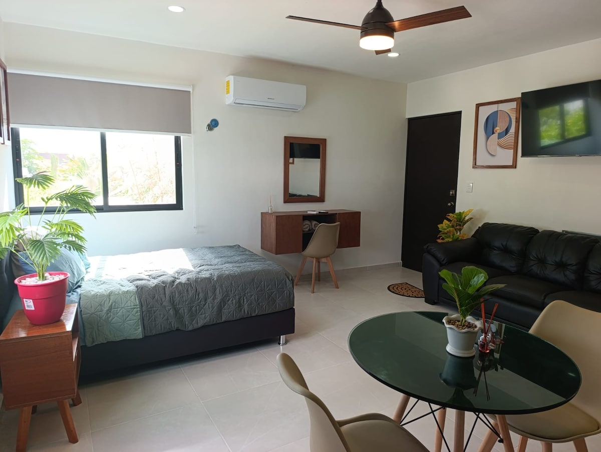Bienvenido a tu refugio en Temozón Norte, una de las zonas de mayor crecimiento en Mérida, que aún conserva su tranquilidad y entorno natural. Nuestro departamento de una habitación es ideal para descansar y disfrutar: cuenta con cama king size, closet, baño privado y un cómodo sofá cama matrimonial en la sala para huéspedes adicionales. Disfruta de tu propia piscina privada en la terraza o aprovecha las amenidades del edificio como el gimnasio, piscina común, pet park y salón de eventos.