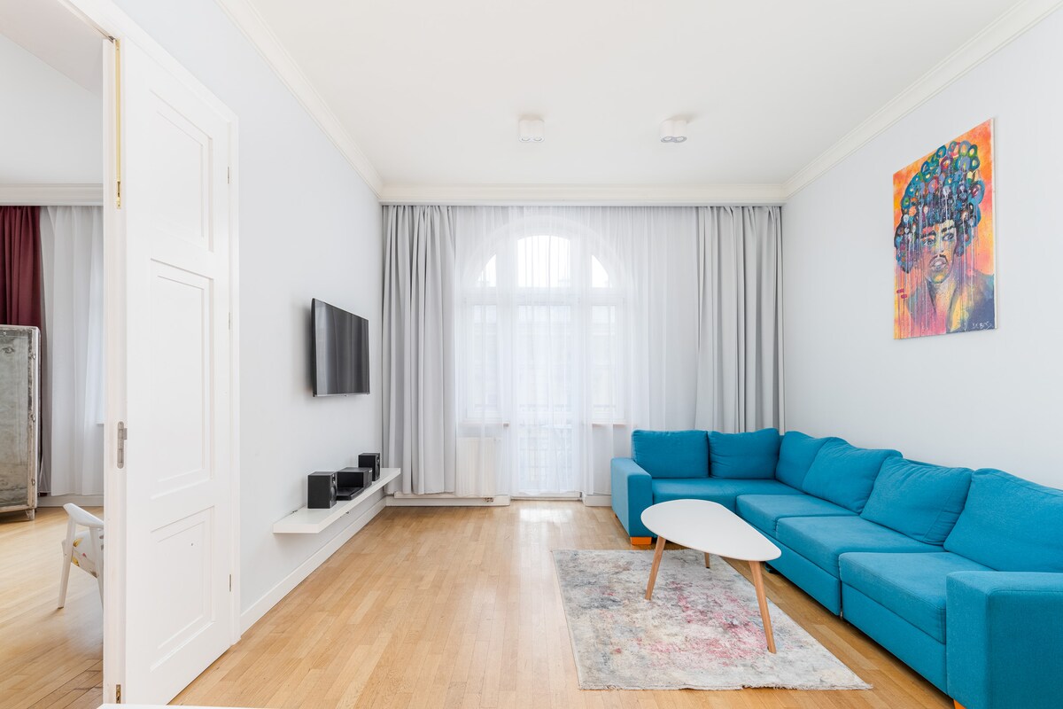 Apartamento de design vintage clássico situado no segundo andar de um prédio histórico com vista para a rua e pátio, sala de estar, cozinha totalmente equipada, espaço para refeições, banheiro privativo grande, dois quartos tranquilos, cada um mobiliado com uma cama de casal confortável. Ar condicionado, aquecimento, Netflix, Wi-Fi, secadora de lavadora e outras comodidades fornecidas para uma estadia de curta ou longa duração em Cracóvia.