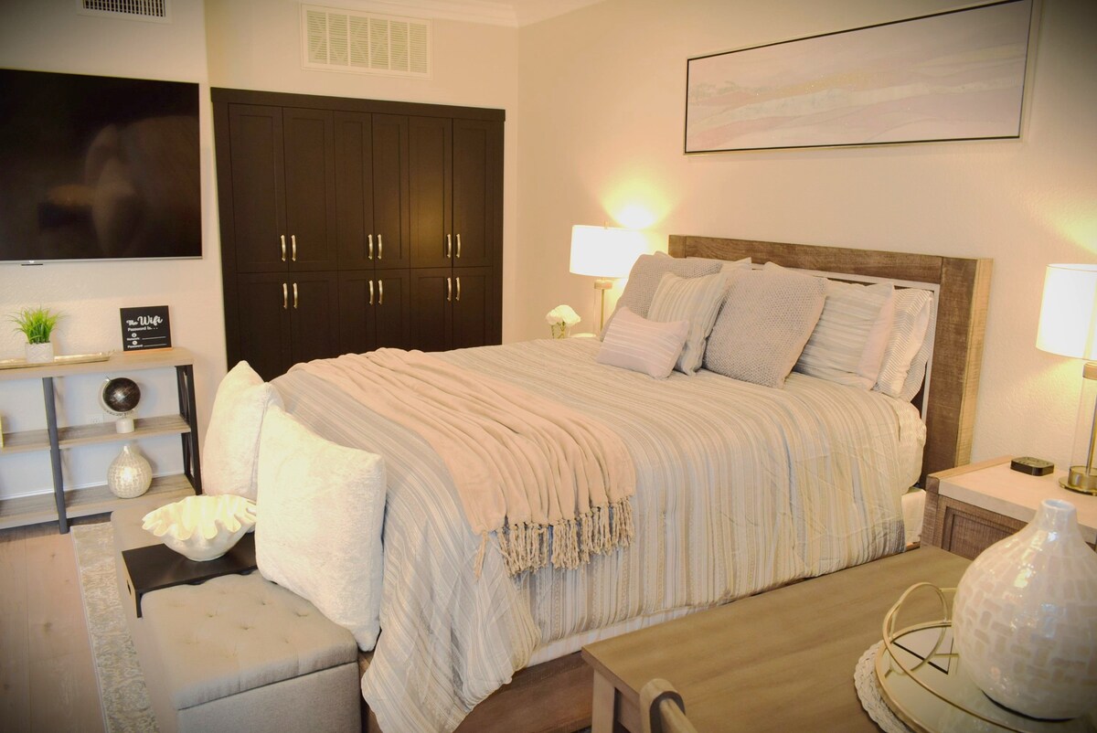 Entrada externa privada. Bem-vindo à histórica Hollywood Beach, uma das comunidades de praia desconhecidas mais escondidas do sul da Califórnia. A poucos segundos da areia, desfrute de uma lufada de ar fresco do oceano e do som tranquilo das ondas. Vida de rainha no seu melhor pela fração dos preços de hotéis próximos. Confortável colchão amarrado à mão da marca Aireloom é uma alegria para dormir. Desfrute desta suíte original de 500 pés quadrados da década de 1980, a poucos passos da Praia Estadual de Oxnard Shores, em Mandalay Dunes.