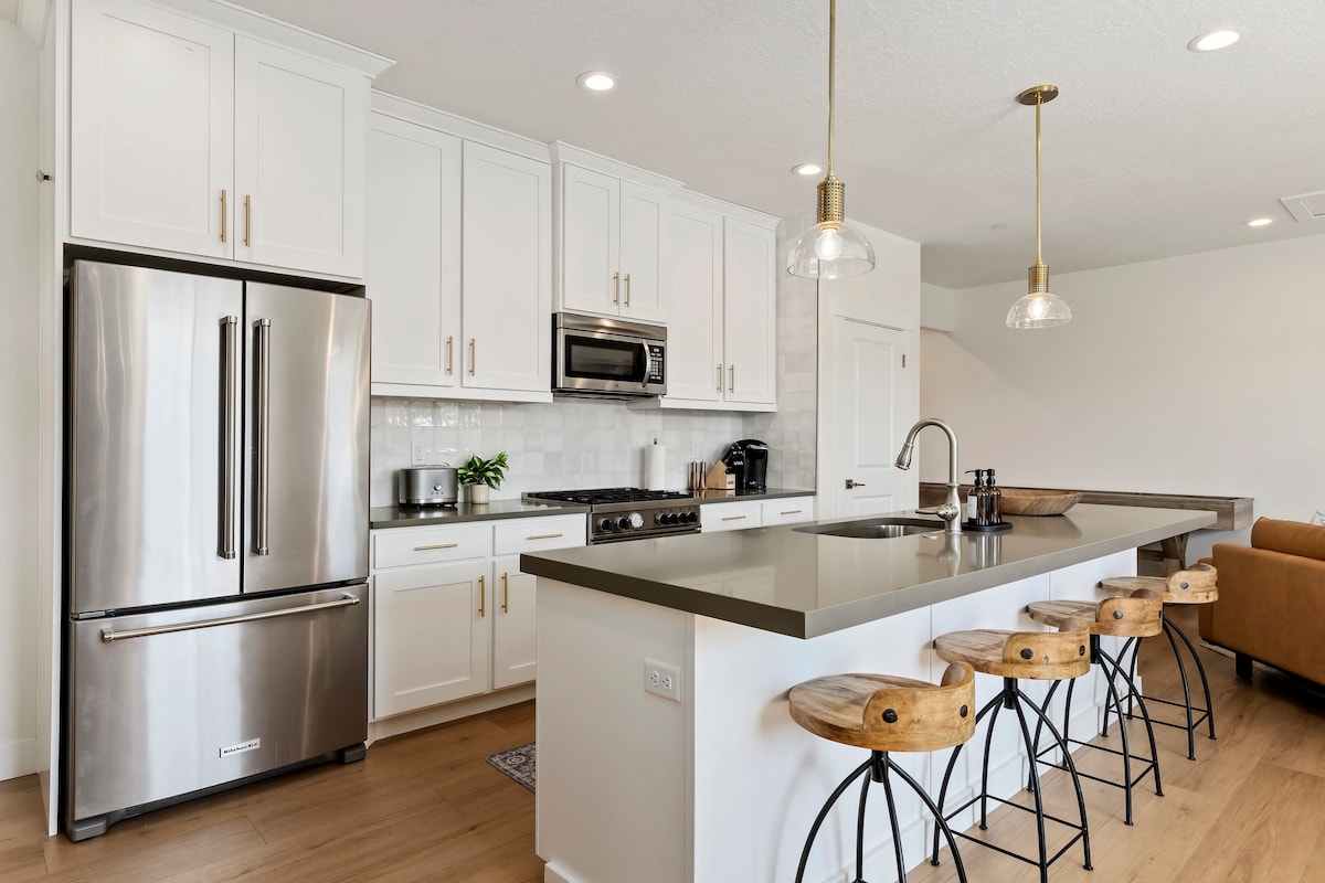Este elegante condomínio tem vistas deslumbrantes para os resorts de esqui Deer Valley e Park City a poucos minutos de distância, com vista para o Reservatório Jordanelle e o Upper Provo River, em uma nova comunidade de casas de luxo chamada Benloch Ranch. Sente-se na banheira de hidromassagem privativa para 7 pessoas ou na sauna finlandesa ao ar livre, apreciando as vistas magníficas, faça ioga ao ar livre no deck ou relaxe depois de um dia de esqui, caminhada, ciclismo, pesca com mosca, SUP nos lagos do bairro ou no lago próximo, ou outras atividades na região de Park City.