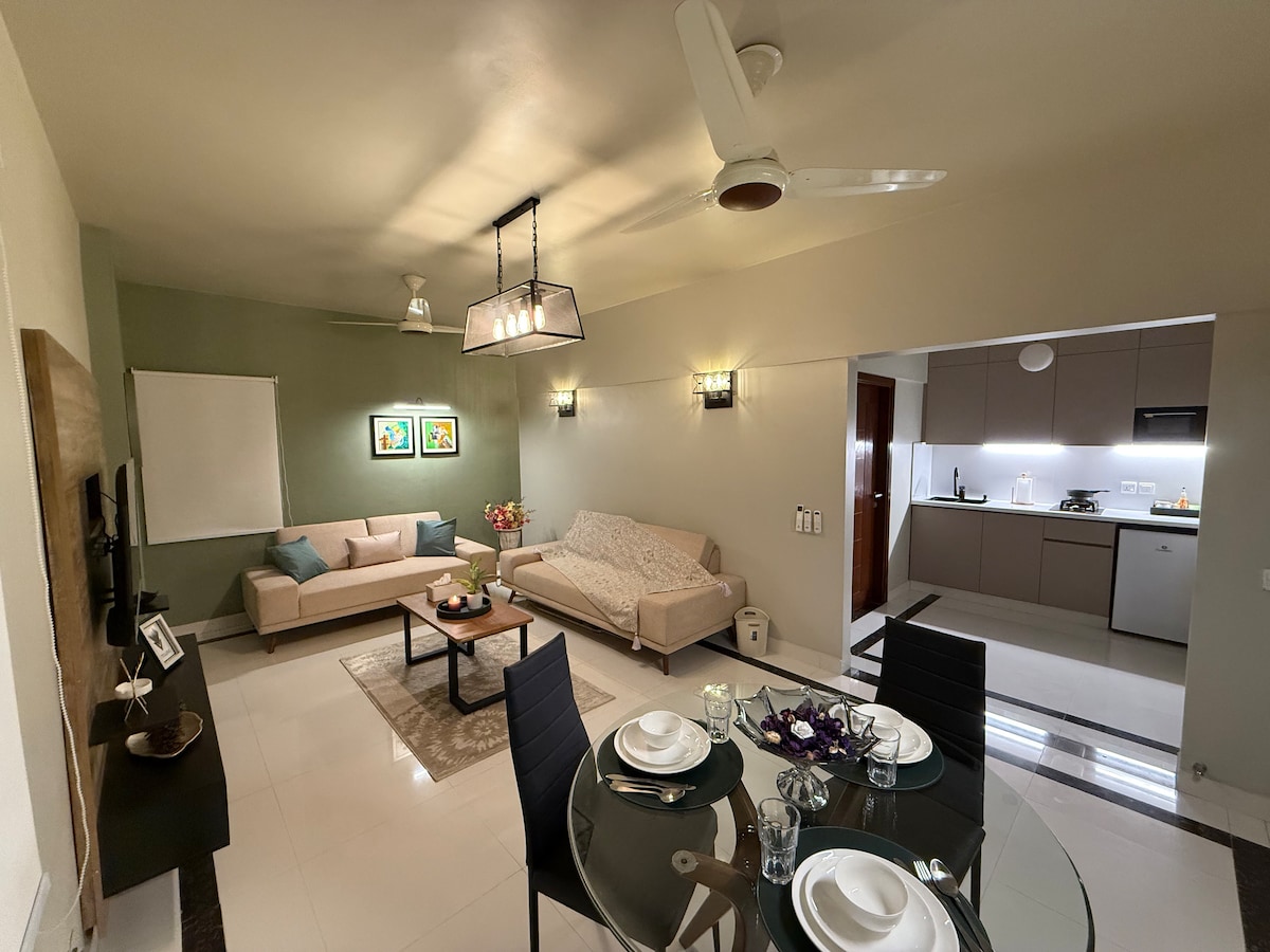 Experimente conforto e luxo neste elegante apartamento de esquina. Localizado na Fase 6 do DHA, a apenas um quilômetro da praia. Desfrute de uma cama king size, TV LED de 70", ar-condicionado, Wi-Fi rápido e cozinha privativa 🍳 Netflix e governanta 24 horas, 7 dias por semana, incluídos para uma estadia sem preocupações 💼 Água potável 🥛 e chá complementar☕🍵 Perfeito para viajantes que buscam elegância e conveniência!