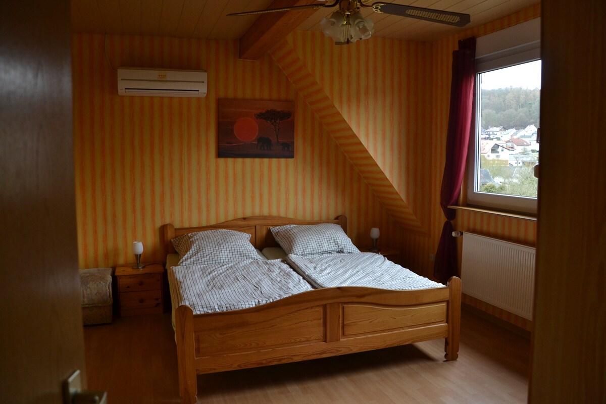 Sente-se e relaxe... Nosso apartamento de um cômodo foi construído apenas com materiais naturais. Com muito amor pelos detalhes, trabalhei aqui com ardósia natural e madeira de carvalho. O interior de alta qualidade convida ao relaxamento. Aqui, na porta de entrada para Vogelsberg, encontra-se, entre outras coisas, a entrada para a trilha de mountain bike vulcânica "Mühlental". Estação de carregamento de bicicletas diretamente no apartamento. Depois, uma sessão de sauna? Se estiver interessado, existe a possibilidade de fazer um passeio com meus carros clássicos americanos ;-)