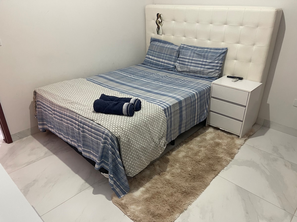 Apartamento com cama de casal, ambiente limpo e seguro, com quarto que possui lençóis de ótima qualidade, cobertores macios, cozinha com área de alimentação e trabalho, com louças disponíveis, microondas, chaleira elétrica, frigobar e de brinde pó de café para o preparo de seu cafezinho e no banheiro tem sabonete líquido, shampoo e toalhas branquinhas.