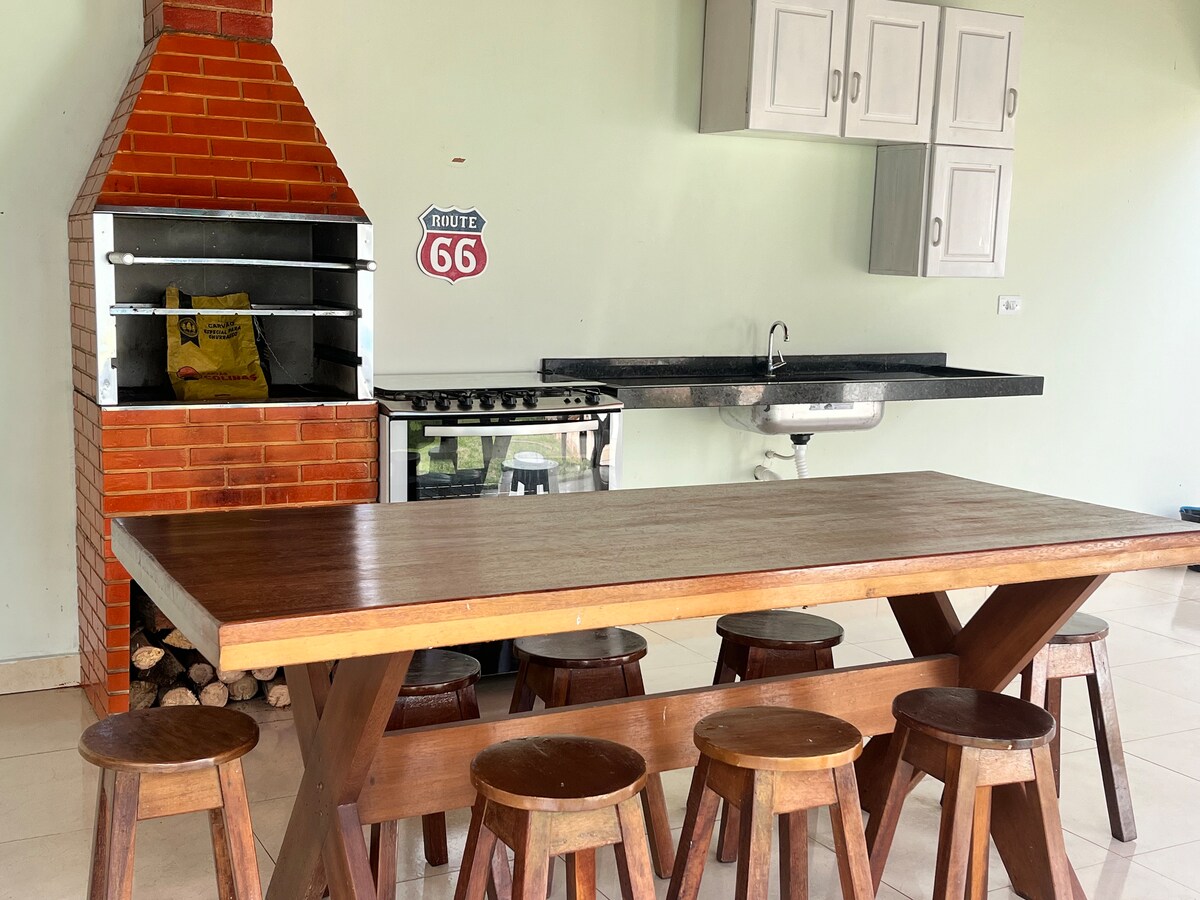 Você vai adorar a decoração estilosa deste charmoso lugar para ficar. Nossa chácara incluí piscina com vista a natureza, toda nossa chácara está rodeada de natureza. Também incluímos uma área de lazer com churrasqueira, e redes para área de descanso. Logo após temos uma escada para subir ao andar de cima, onde temos um quarto com cama e sofá, mais colchões podem ser adicionados. Também temos banheiro com chuveiro, e chuveiro externo na área de piscina.