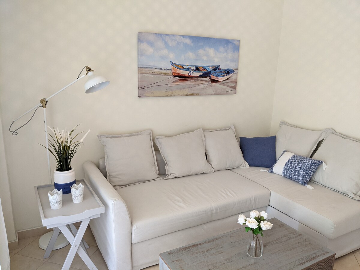 Espaço único para tornar suas férias inesquecíveis! Ambiente maravilhoso à beira-mar! Cheio de conforto com uma vista excelente e o melhor pôr do sol da Grécia no seu prato!! A praia fica em frente à casa, a 1 minuto a pé, é muito grande e com areia!! Há restaurantes, supermercados e farmácias a 5 minutos da casa!
