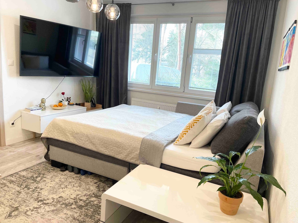 O estúdio renovado está localizado no centro da cidade, no terceiro andar de um edifício, no sótão. O estúdio está equipado de forma a separar a parte noturna da parte diurna. O estúdio inclui um banheiro separado com vaso sanitário. A cozinha está equipada com uma geladeira embutida, placa de indução portátil e utensílios básicos. Toalhas e secadores de cabelo estão disponíveis para os hóspedes no banheiro. O preço do alojamento inclui também a roupa de cama. O centro fica a 3 minutos a pé. É proibido no estúdio, bem como em todo o edifício.