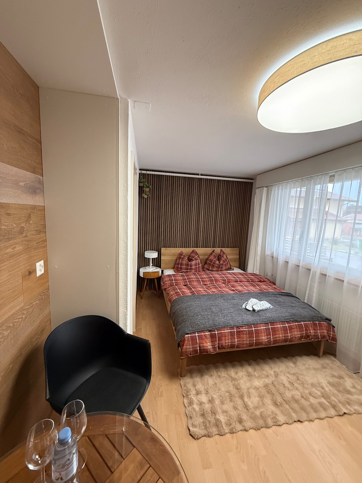 Im ausgebauten Estrich eines Chalets befindet sich eine freundliche und helle 1-Zimmer-Wohnung mit Kochnische und privatem Badezimmer mit WC, Dusche und Lavabo. Die Küche hat zwei Herdplatten, eine Nespressomaschine, Wasserkocher, Kühlschrank und einen kleinen Backofen. Geniesse die Fernsicht in die Berner Alpen oder bei schlechtem Wetter den Satelliten-TV. Das Doppelbett ist 1,60m x 2m gross.