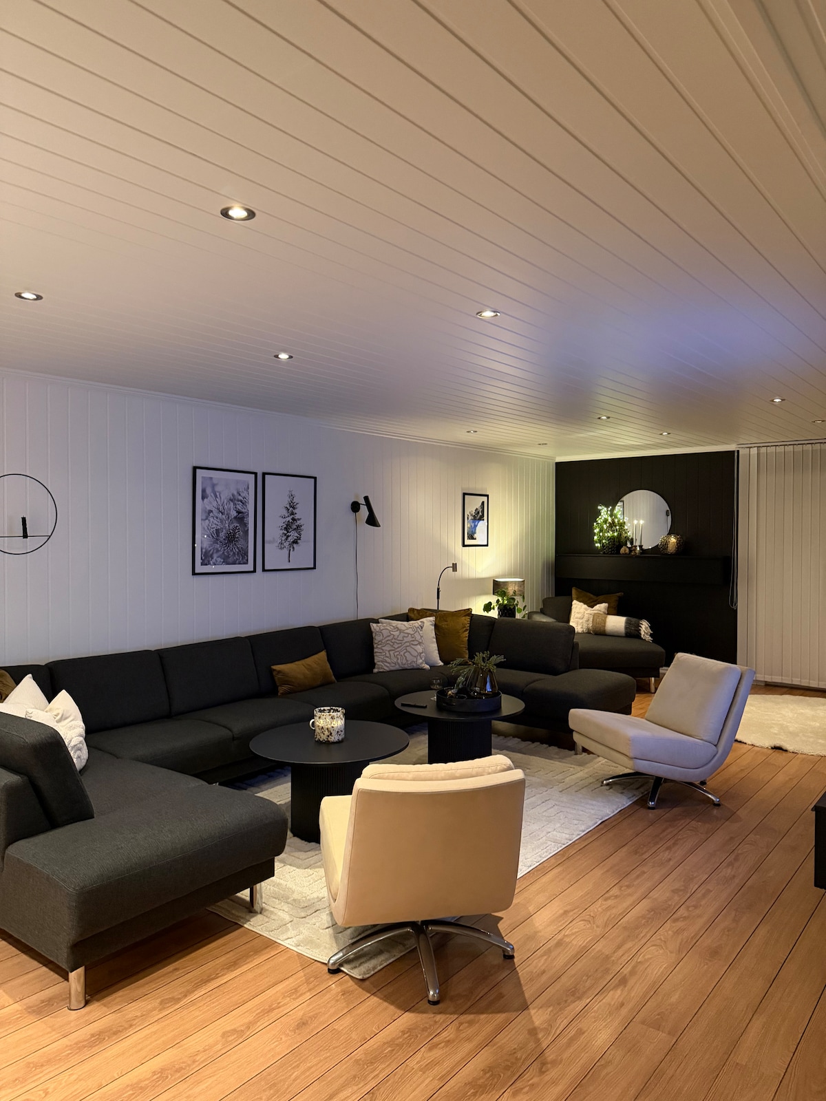Flott hytte med utsikt til fjell, sjø og nordlys