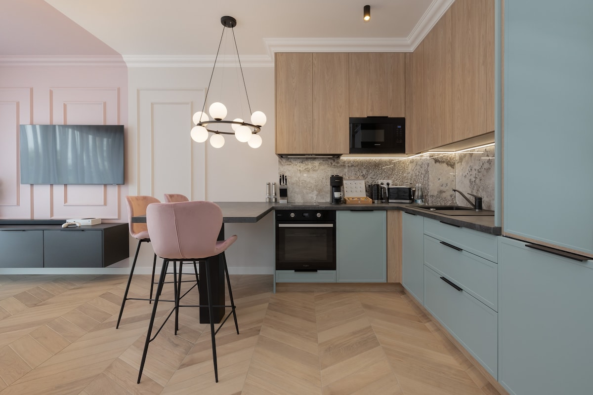 Apartamento confortável, de 2 quartos, bem equipado, no segundo andar, com terraço, vista lateral para o mar e vaga de estacionamento na garagem subterrânea. Está localizado diretamente na descida para a praia. Apartamento elegante e aconchegante, iluminado, limpo. O equipamento para os nossos hóspedes inclui sempre roupa de cama fresca, um conjunto de toalhas, cosméticos, água mineral.