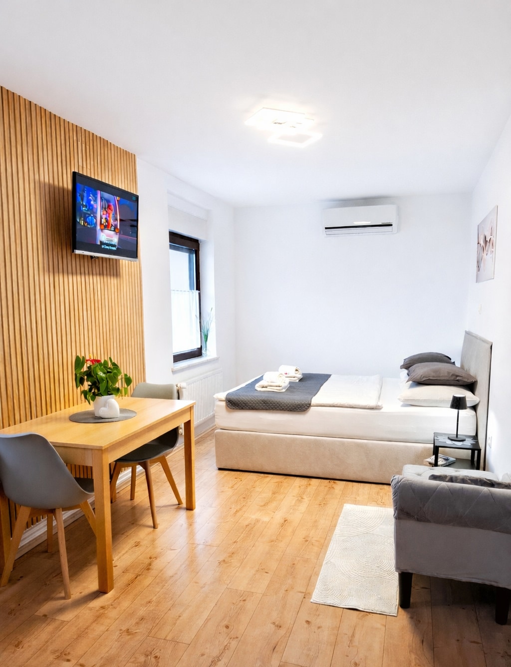 Oferecemos um belo apartamento na área suburbana mais tranquila de Bled. Tem uma linda estrutura de madeira combinada com alguns elementos modernos que tornam o apartamento um lugar acolhedor e acolhedor. Na frente há um belo terraço com uvas. Ao lado do apartamento é uma ótima academia com muitas coisas divertidas para crianças, também com um conjunto de equipamentos para um treino se você é um esportista. Temos um grande estacionamento para nossos hóspedes em frente à casa. Oferecemos descontos.