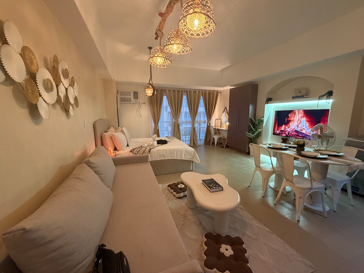 Um apartamento de 34 m² totalmente mobiliado, digno de IG, aconchegante e elegante, com 2 quartos e uma varanda incrível onde você pode relaxar, comemorar eventos importantes ou apenas fazer uma escapada rápida com sua família ou amigos e desfrutar de comodidades únicas de classe mundial, como a piscina de ondas, praia branca artificial, parque infantil, quadra de basquete, academia, quadra de vôlei, bar de praia, jardim suspenso e muito mais. Fica a apenas 5 minutos a pé de um shopping (SM Bicutan) e a apenas 10-15 minutos do Aeroporto NAIA.