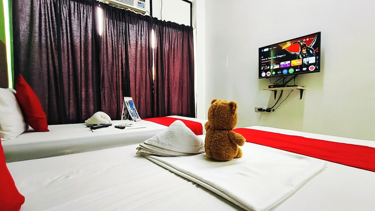 Bem-vindo ao Crazy Luxury Suites at Ain Borja - o nosso elegante restaurante no bar do hotel. - Acomoda até 4 hóspedes - 2 quartos elegantes (cama queen size, 2 camas de solteiro e um sofá) - Quartos totalmente climatizados - Acesso ilimitado à Netflix e ao YouTube em uma Smart TV de 55 polegadas - Videogame, mini karaokê, jogos de cartas e tabuleiro - Wi-Fi de alta velocidade de 200 Mbps - Espelhos perfeitos para selfies e OOTDs - Smartlock