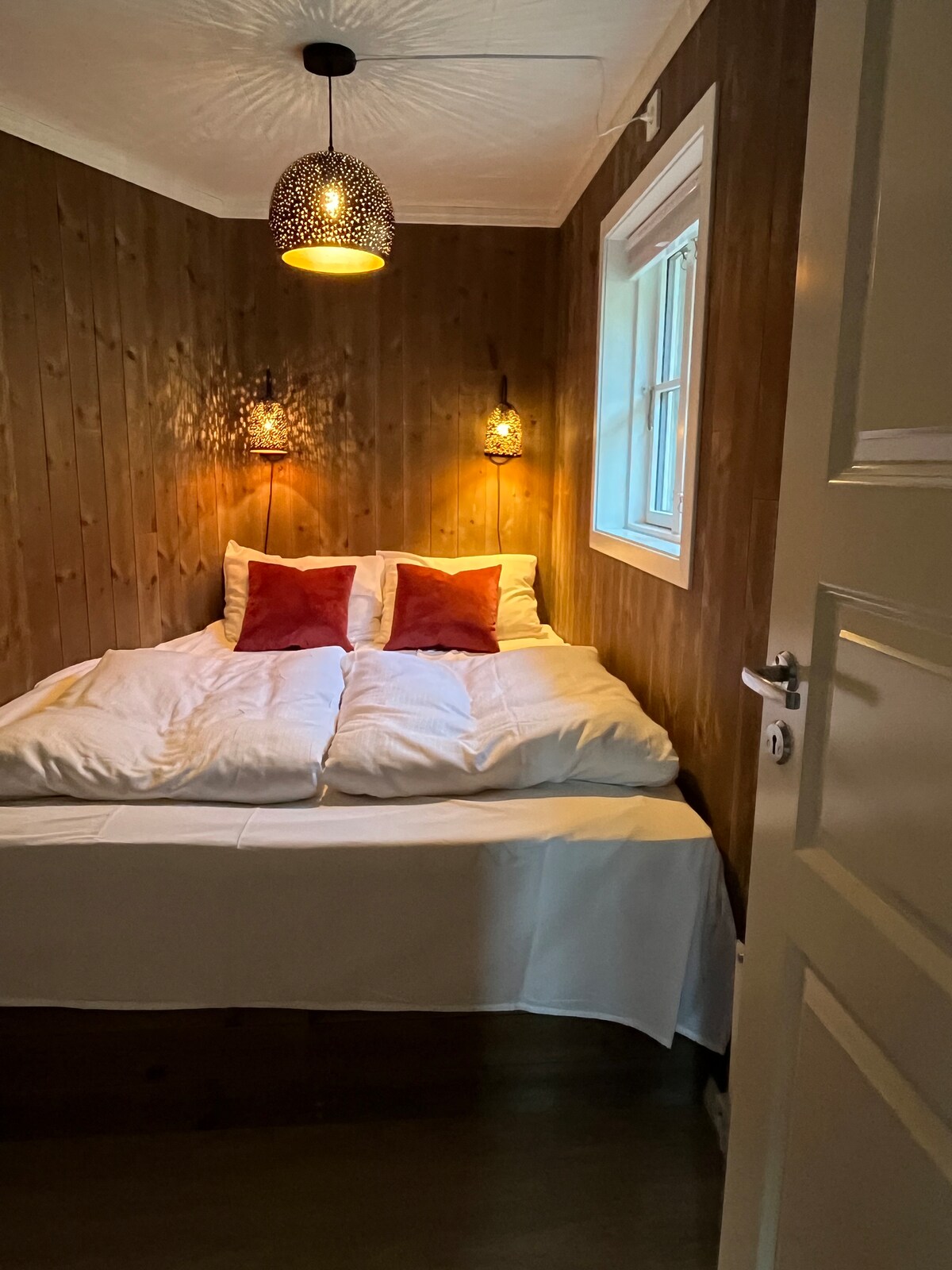 Cabana com vista fantástica em ambiente tranquilo. Curta distância até o fiorde e um barco a remo está disponível durante o verão. A cabana tem uma mini cozinha, geladeira, um pequeno forno e microondas. Sem máquina de lavar louça. Banheiro com chuveiro e vaso sanitário, cabos de aquecimento no chão. Sala de estar com sofás, mesa de jantar e uma lareira aconchegante. Os quartos são muito pequenos. Varanda coberta com móveis de exterior. Roupa de cama e toalhas não estão incluídas. Quando nevar, você deve estacionar na estrada e caminhar os últimos 50 m até a cabana. Estacionamento na cabana durante o verão.