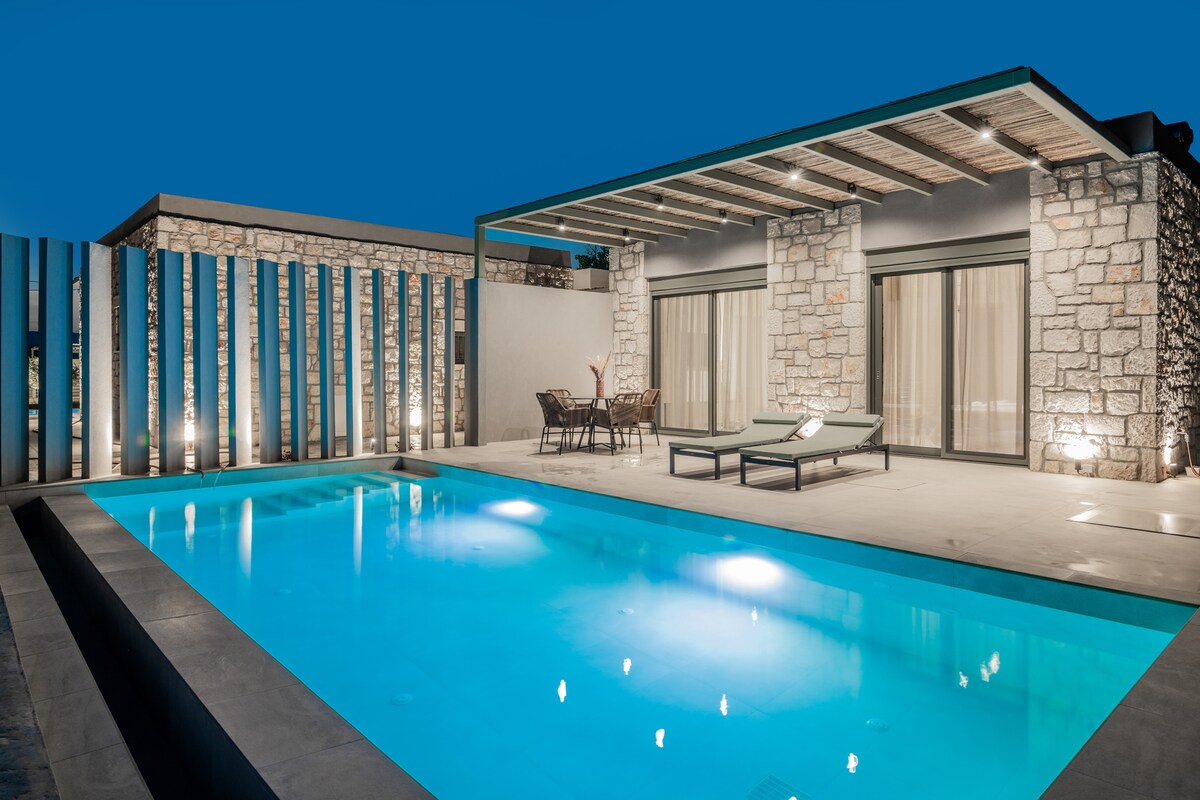 This impressive property is located in Akrotiri, on top of a hill, enjoying clear panoramic views both towards the port and the town of Zante. It is conveniently situated only 4 km distance from the harbor and the main square of the old town. The BoConcept furniture in the living room, the bedroom with COCO-MAT’s natural sleep systems and bedding as well as the soft touch of high quality Guy Laroche linen complete the feeling of a luxury stay.
