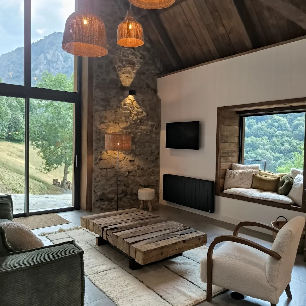 A modern atmosphere and traditional building meet at this lodge situated at the foot of the Pyrenean Mountains. With its sober and minimalist style the house invites you to sit back and disconnect. Around you will discover a setting where simple beauty and grandiose nature calm your senses. A real treat in well-being for all. Whether you choose to hike or just settle with a book, it offers you a vast green scenery with spikes of mountains and fluctuating light.