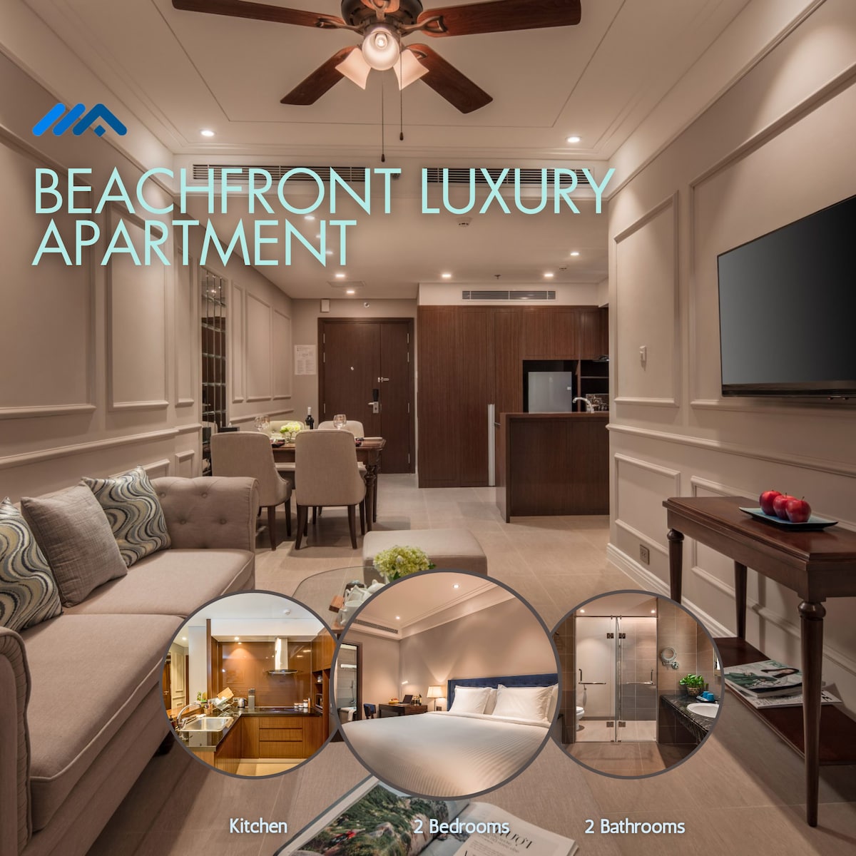 Welcome to our unique oceanfront corner suite right across My Khe beach. It is meticulously designed with a coastal theme and equipped with high-end furnishing. With 80 square meters of elegantly designed living space, our beach home promises a truly unforgettable stay. Important Notice: Our property is situated right at the central beach, directly across from where holiday events take place. Additionally, there's a bar nearby that plays music at night.