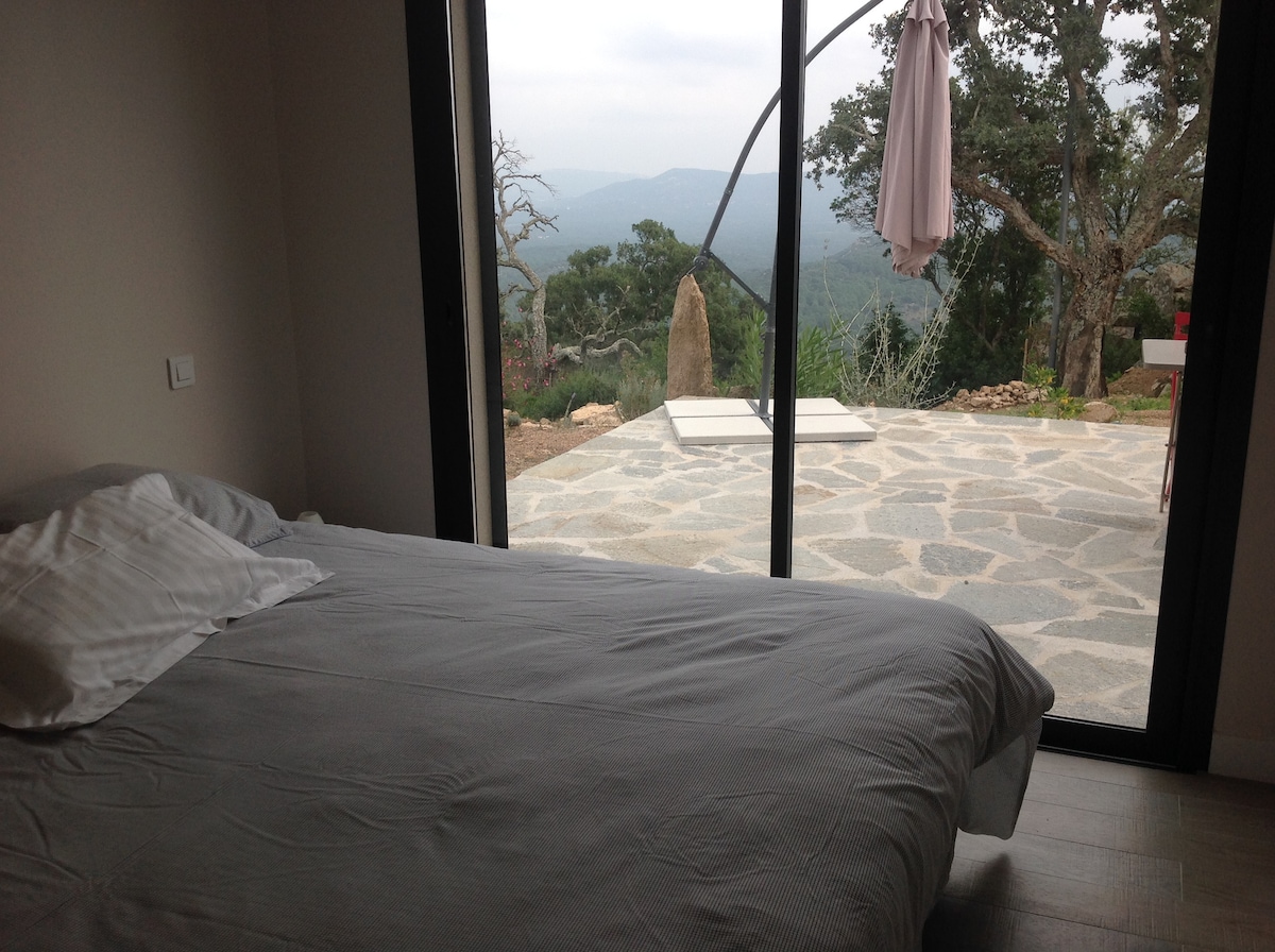 Apartamento localizado no andar de baixo de uma vila nova. Entrada independente, cozinha equipada, terraço, churrasqueira, TV, ar-condicionado, equipamento de fibra. Um quarto com uma cama de casal + um sofá de alta qualidade conversível na sala de estar. Cozinha aberta Acomodação tranquila. Ideal para casais ou famílias com crianças. Acesso à piscina aquecida. Vista magnífica para o mar e a montanha. Localizado a 15 minutos do aeroporto de Figari, a 20 minutos das grandes praias de Palombaggia, Santa Guilia.