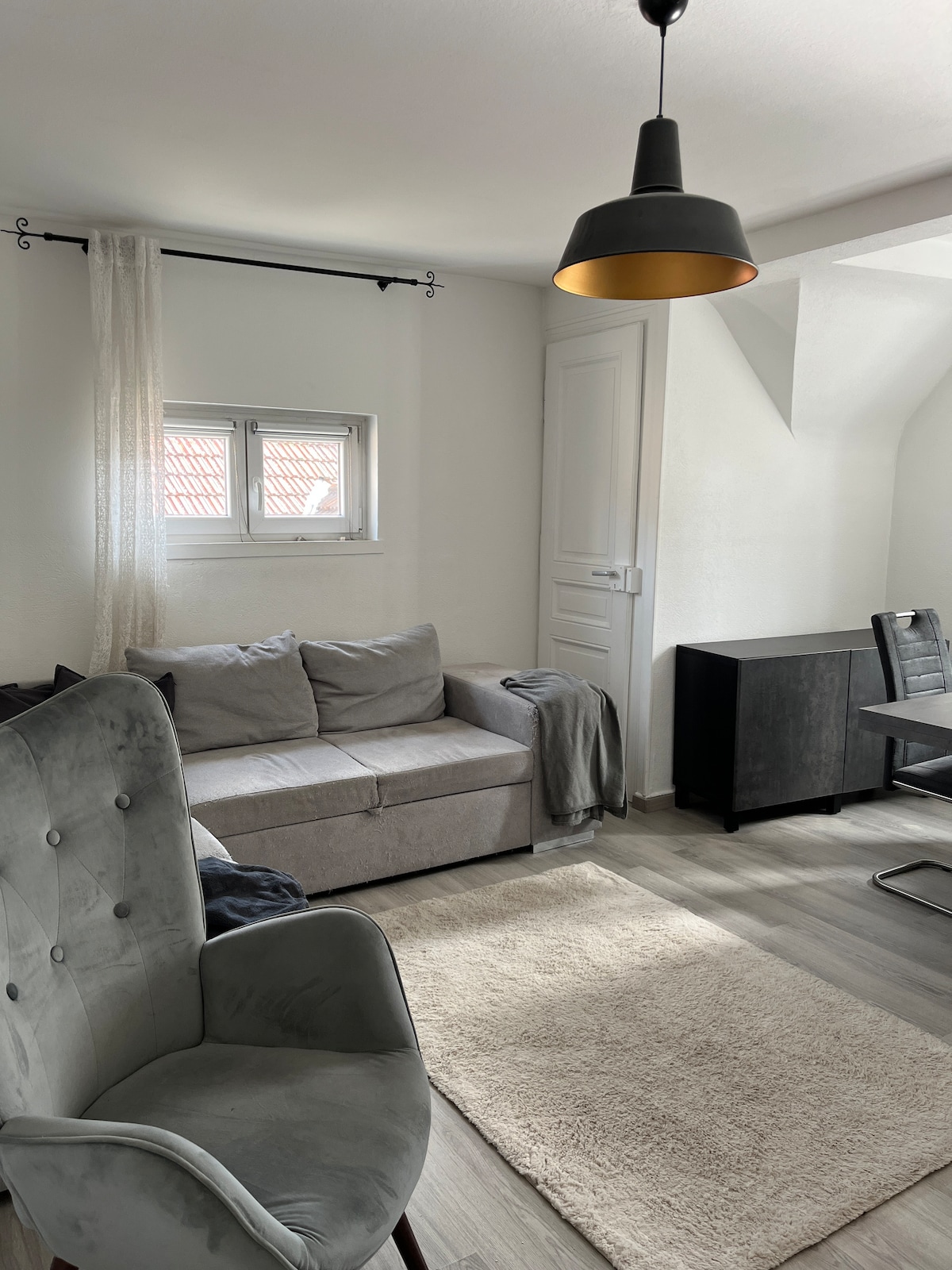 Estúdio de 30 m² + mezanino, em um ambiente acolhedor, teto alto. As camas de casal estão na sala de estar e no mezanino, com uma cozinha funcional e um banheiro-WC. Estacionamento gratuito no pátio fechado para um carro ou van. Fácil acesso a Estrasburgo de ônibus, bonde ou trem. Acesso wi