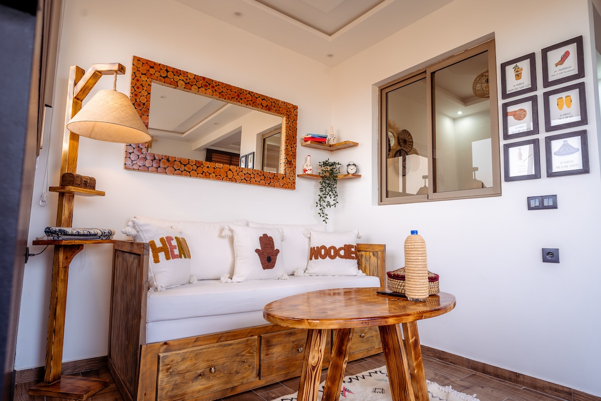 O Wooden Heaven é um apartamento com temática única no centro de Essaouira, com um layout aberto e um terraço espaçoso com vistas panorâmicas magníficas para toda a cidade. Com ênfase na madeira, o interior exala calor e charme, oferecendo um retiro sereno. Os hóspedes podem desfrutar de vistas de quase 360 graus, perfeitas para testemunhar o nascer e o pôr do sol de tirar o fôlego. Este apartamento promete uma estadia verdadeiramente excepcional, combinando conforto moderno com vistas incomparáveis da vibrante paisagem urbana de Essaouira.