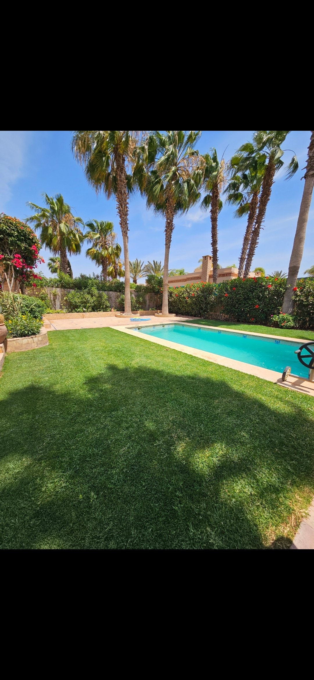 Vila muito bonita de 120m2 em terreno de 550m2 composto por 2 quartos, 2 banheiros, grande jardim fechado sem vis-à-vis, piscina privada de 4*8m grande terraço coberto. Pátio. Os hóspedes terão equipamento completo, cozinha com micro-ondas, forno, máquina de lavar louça. A vila tem Wi-Fi, máquina de lavar roupa e tudo o que você precisa para umas férias perfeitas. Localizado na propriedade segura Dyar Shemsi, você pode desfrutar de estacionamento compartilhado, piscina comum de 300m2, academia, etc.