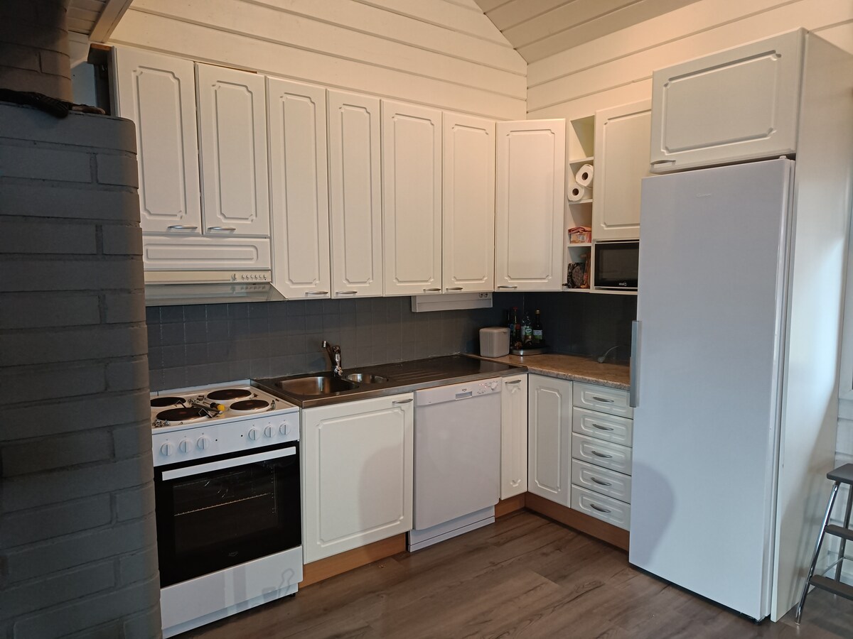 O chalé tem 2 quartos e uma sala de estar combinada com a cozinha, um terraço com móveis para relaxar. É permitido fumar apenas no terraço, não é permitido fumar dentro de casa. A cozinha tem tudo o que você precisa para cozinhar - fogão, forno, micro-ondas, chaleira, torradeira, cafeteira, geladeira, bem como um conjunto completo de louças, máquina de lavar louça e máquina de lavar roupa. A lenha é fornecida para a lareira. Há uma sauna e um armário para secar roupas. Você pode trazer sua própria roupa de cama ou alugar. O custo é de 12 euros por pessoa.