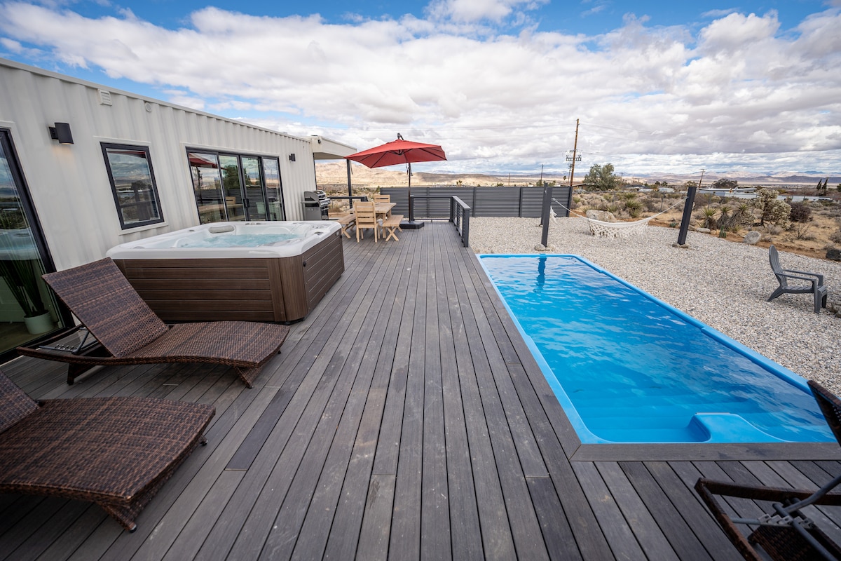 Bem-vindo ao Blok Studio. Esta é uma nova e moderna casa de contêineres única, que possui (4) contêineres de cubo de 12 metros de altura, DirecTV, grande envoltório ao redor do deck, piscina AQUECIDA com contêiner de 20'e banheira de hidromassagem!! Ótimo lugar para relaxar nas áreas de estar ao ar livre serenas, com vistas deslumbrantes da paisagem de Joshua Tree. A propriedade está localizada no lado sul da 62 Highway. Apenas 1,6 km do centro da cidade e 6,4 km da entrada oeste do Parque Nacional de Joshua Tree!