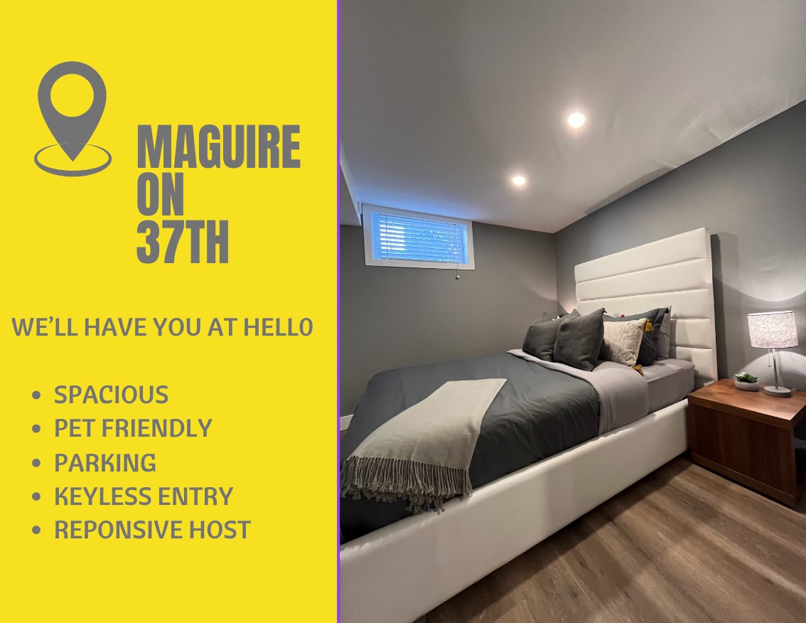 Elegant 2BR Walkout Basement is a private, meticulously curated retreat offering refined comfort and quiet luxury.Enjoy warm evenings by the fireplace and abundant natural light from large windows.This spacious two-bedroom suite features a queen and a double bed ideal for guests who value privacy,cleanliness and an elevated standard of comfort. Direct backyard access and dedicated driveway parking are included.Steps from the Bow River pathways, Sobeys,Seton YMCA and South Health Campus Hospital.