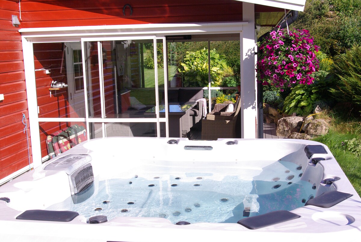 Cabana familiar ensolarada com banheira de hidromassagem e grande área externa.