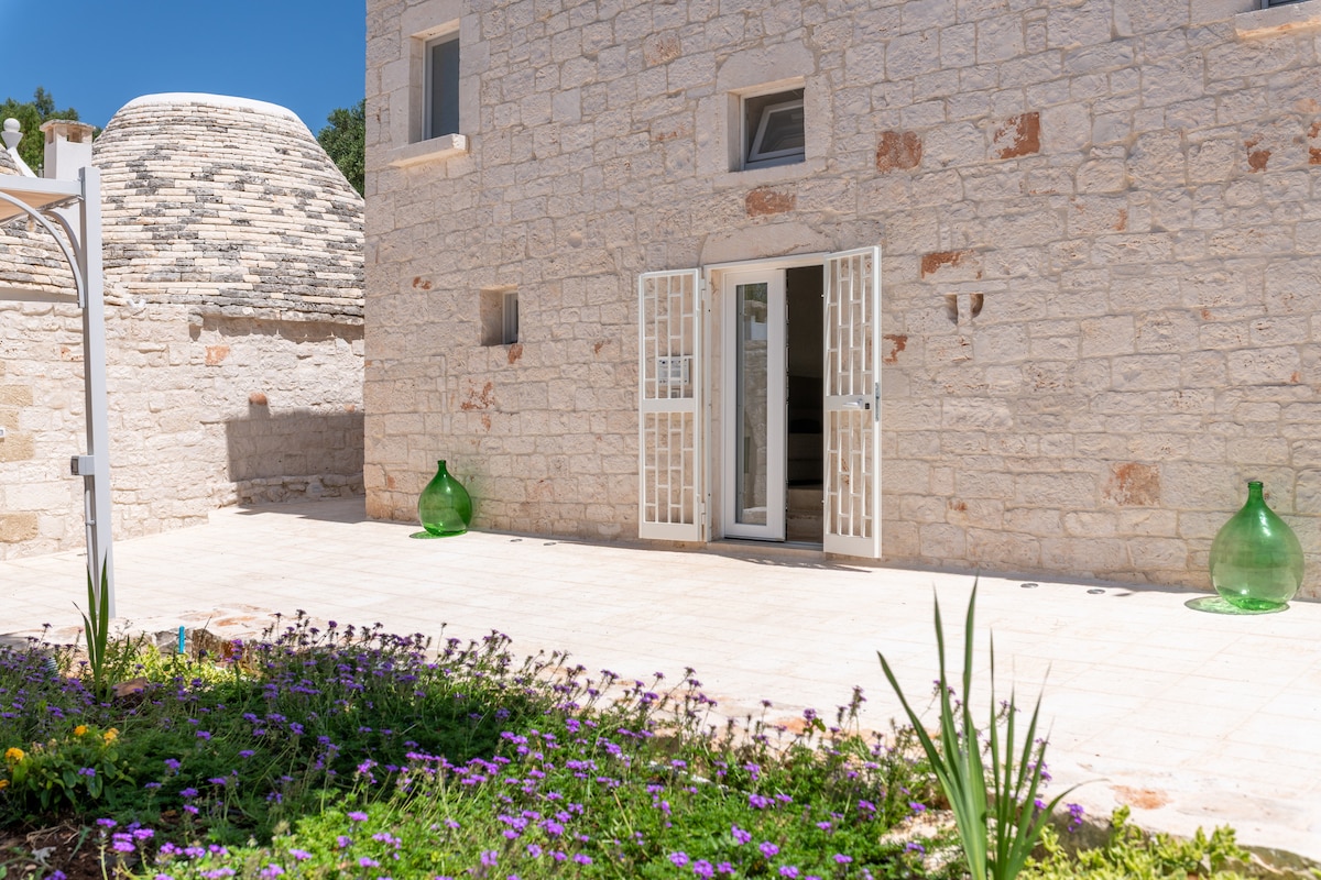 Incrível Masseria(casa de fazenda) com piscina privada do '800 mergulhe na natureza(Valle d' Itria)com vista para a cidade de Cisternino e cercada por casas típicas de forma cônica (trulli). A Masseria é única por sua decoração e uma piscina privativa. Quintal grande com figueira e rúcula selvagem. Belas praias em Torre Canne estão a 16 km de distância e a 3 km da cidade velha. Boa localização perto de Alberobello, Martina Franca, Ostuni e outras belas cidades. Acesso gratuito à piscina aquecida salgada do il Portico.
