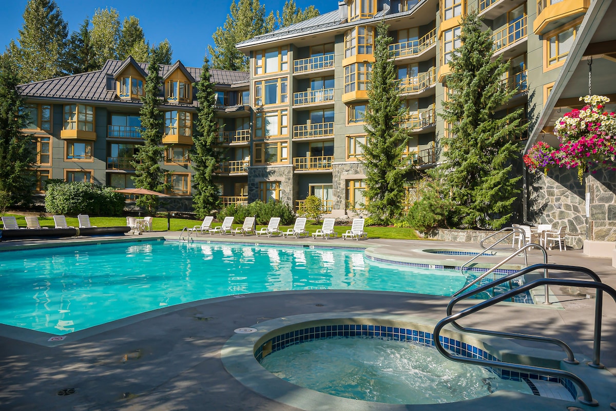 This spacious, high-ceiling condo features a sunken living room, open-plan kitchen, and proper air conditioning in each bedroom and the living room. Enjoy the outdoor pool and hot tub with unbeatable views. Just a 20-minute walk to Whistler Village and steps from Lakeside Park, bike trails, and the golf course—this prime location has all the amenities you need for a perfect Whistler vacation. Includes free parking and a secure bike room. Ideal for year-round stays!