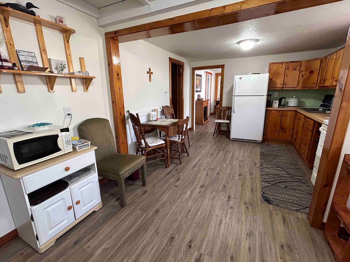 Estamos a uma curta distância a pé das docas, com vista para o porto. Temos um belo quarto de 4 estações na frente da casa. Ficamos a uma curta distância a pé do restaurante Driftwood, da sorveteria Molly Moo's e do centro da cidade. Compartilhamos um estacionamento, por isso estamos por perto, se necessário. Este é o primeiro andar de um prédio de dois andares com inquilinos no andar de cima. Há um cão na propriedade. A lavadora e secadora estão localizadas no porão e são gratuitas.