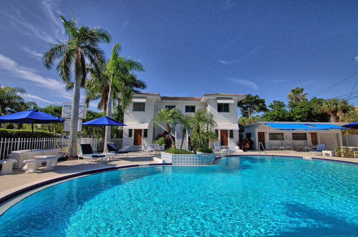 Bem-vindo ao GulfSide Resort, uma joia de propriedade familiar a apenas um quarteirão e meio de St. Pete Beach! Nossas confortáveis suítes de férias estão de frente para uma bela piscina e estão a poucos passos de bares de praia, restaurantes e lojas. Aproveite nossa piscina, shuffleboard e campo de golfe, além de cadeiras de praia e brinquedos gratuitos. Perfeito para reuniões de grupo, podemos receber até 35 hóspedes confortavelmente. Relaxe e divirta-se com seus entes queridos no GulfSide Resort, seu destino de férias ideal! Estúdio 5 acomoda 3.