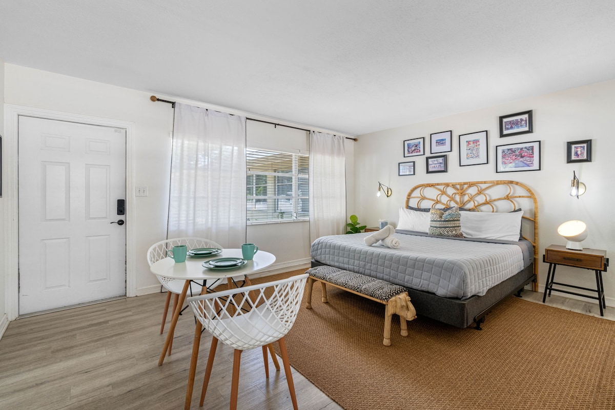 Faça uma pausa para relaxar neste oásis sereno. Este lugar elegante é perfeito para duas pessoas. (Colchão de ar disponível mediante solicitação se houver um terceiro hóspede). A apenas 7 minutos do centro de St Pete, a 15 minutos do TIA, a 20 minutos da praia de St Pete, este espaçoso estúdio é feito para você e sua família com todas as comodidades necessárias para umas férias relaxantes. Possui uma cama tamanho queen e banheiro recém-renovado, cozinha nova Festas não são permitidas. Proibido fumar 🚭 Animais de estimação permitidos