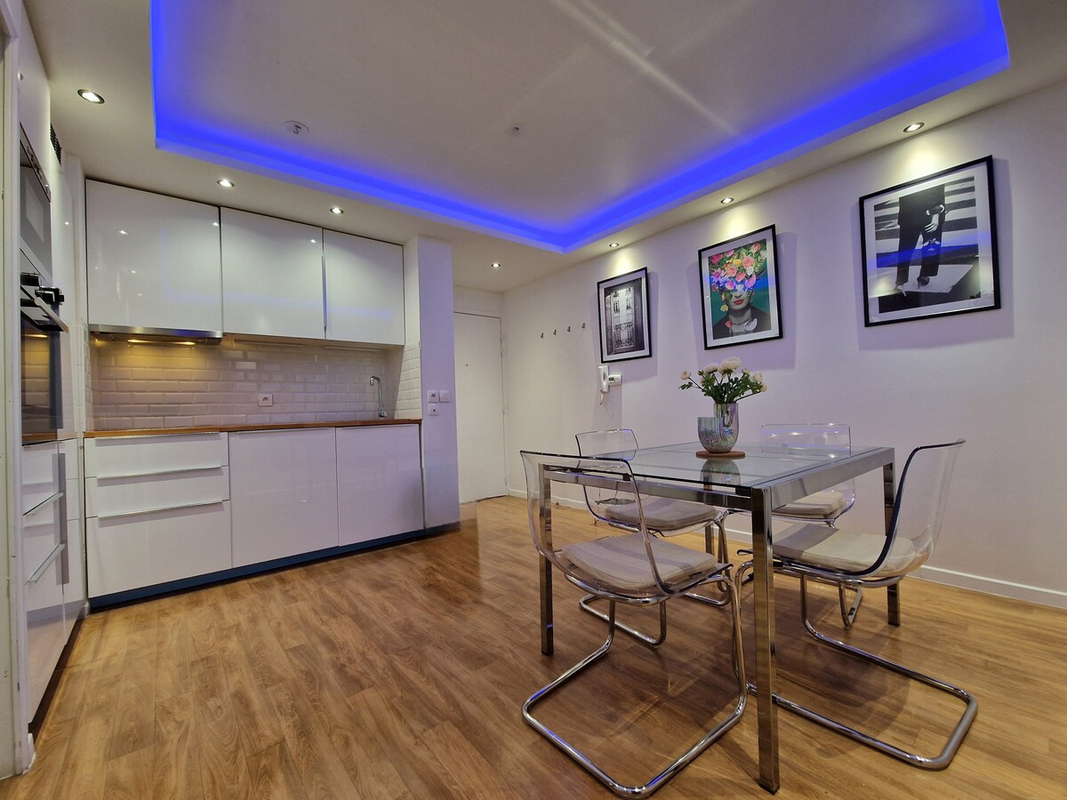 O que torna o nosso apartamento único é, acima de tudo, a proximidade imediata do Stade de France, que fica a apenas 50 metros. ⚐ O estilo do apartamento foi pensado para permitir que você passe ótimos momentos: a mesa de centro é conversível em mesa de bilhar, air hockey ou tênis de mesa. ❤︎ Você pode se divertir com seus amigos ou familiares enquanto aproveita a vista do balcão para a Basílica de Saint-Denis e o Canal de Saint-Denis, sem nenhum vizinho. ☼