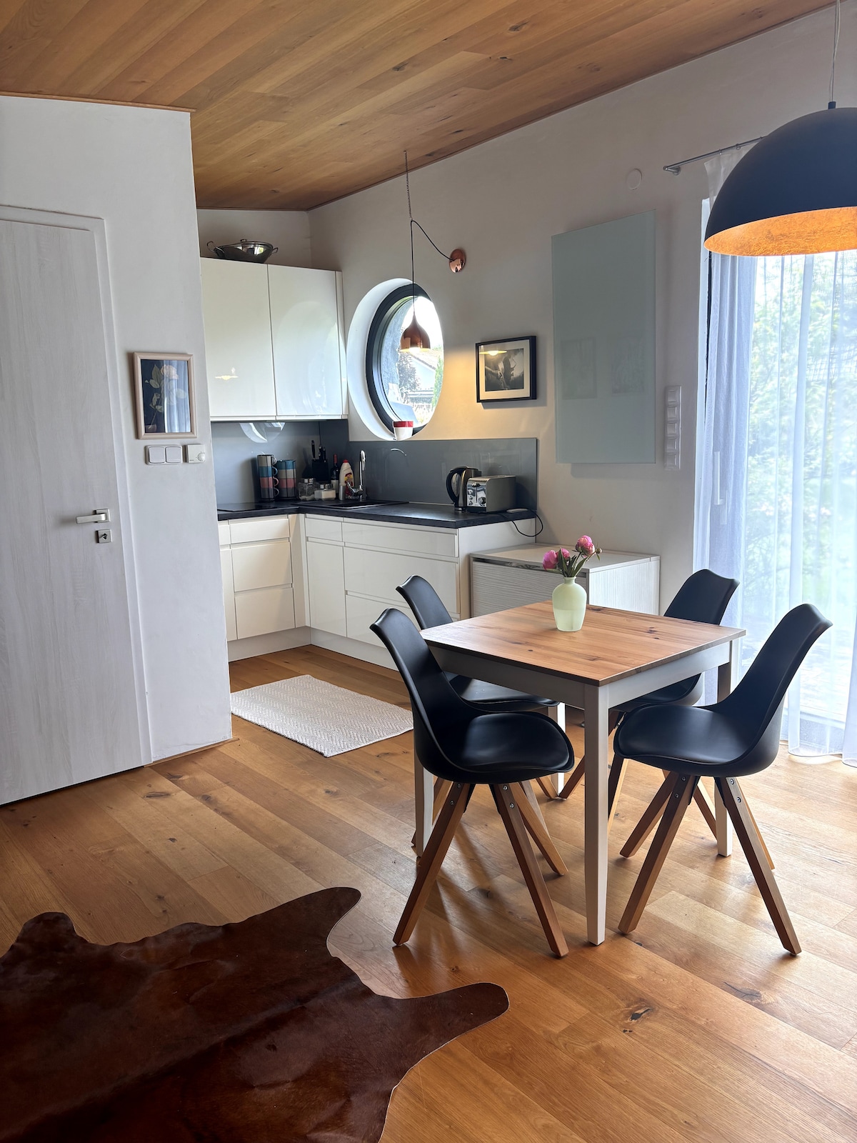 Casa nos meus pés, eu gosto muito, toda a casa é carregada à mão até a colina, eu amo cada parafuso nela. A casa está em uma cidade com um pequeno desenvolvimento. Há algumas casas e um jardim na área, não é uma solidão na floresta. Fica nos arredores da cidade, onde você já pode entrar em contato com a natureza. Há lugares lindos aqui, e vou emprestar bicicletas para vocês poderem ver mais… Vocês também podem reservar e-bikes com antecedência.