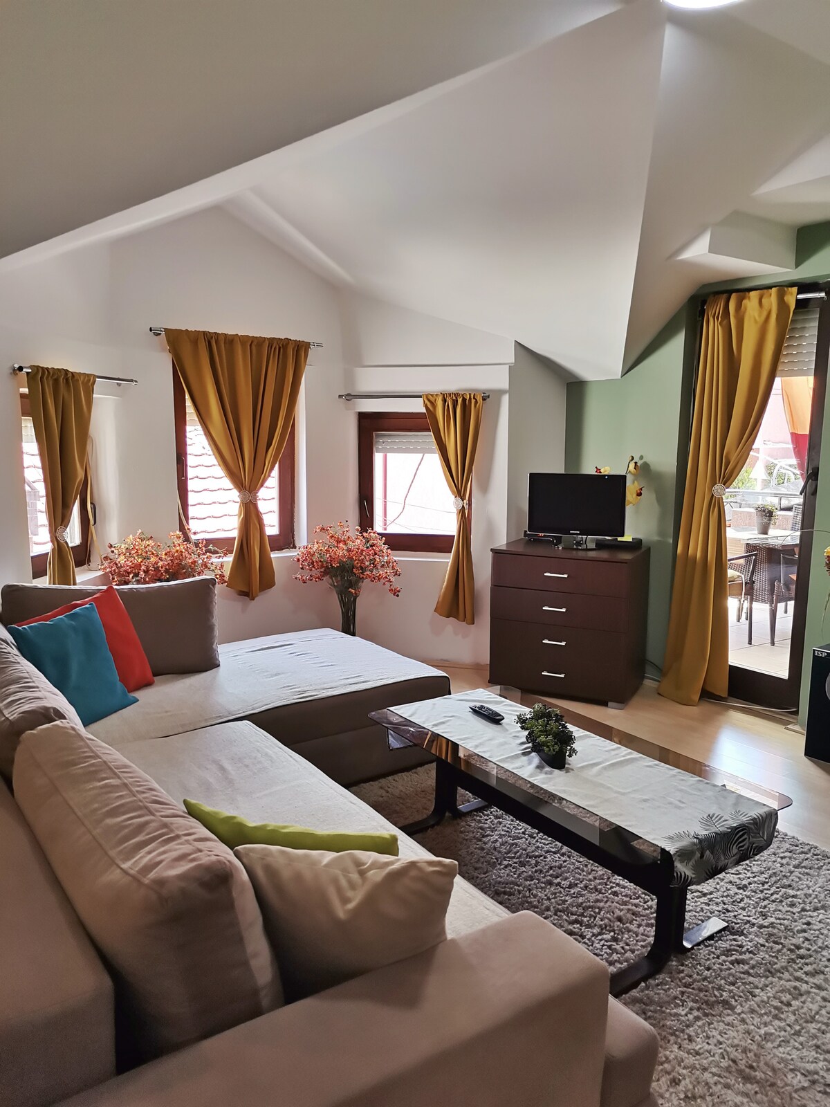A cozy apartment decorated with lots of flowers and plants, spacious and you will enjoy easy access to everything from this centrally located place. The apartment is only 5 minutes away from the main pedestrian street and all of the main cafes and restaurants and just 2 minutes away from the main bus station. It is warm and cozy with 1 separate room, spacious living room, dining room, a fully equipped kitchen, a bathroom and 2 balconies. From 1 balcony you have a great view of the neighborhood.