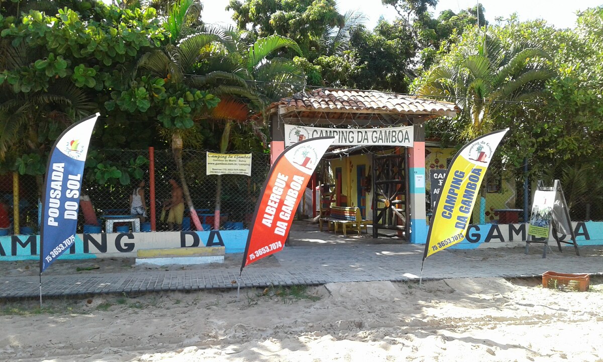 Nosso albergue e integrado e compartilha uma área de camping. Os quartos tem 2 camas de solteiro e um beliche para até 4 pessoas. Apesar de chamarmos "albergue" não funciona como tal, pois a pessoa que reserva fica com o quarto e não colocamos mais nenhuma pessoa a não ser que haja a concordância de quem reservou.Estamos em frente a praia da Gamboa distando apenas 3 km da vila de Morro de São Paulo..A área é totalmente murada. . Oferecemos cozinha com diversos utensílios e Wi-Fi.