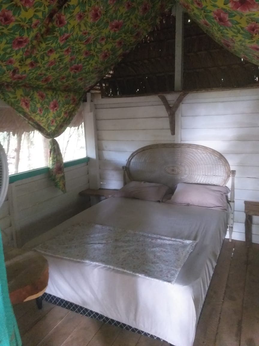 Desfrute a essência da ilha do Marajó . Cabana com mezanino, ideal para famílias pequenas e amigos. Atende 4 pessoas em duas camas, uma tamanho King no mezanino, outra casal no térreo. Espaço para duas redes internas e pequena varanda no jardim de entrada