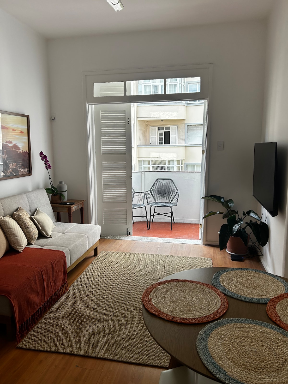 Apê estilo boho chic, na quadra da praia de Copacabana! WIFi 300Mbps e HOME OFFICE. - Cama queen, sofá-cama, mesa de jantar, ar condicionado e home office (Wifi 300 Mb). - Cozinha: fogão/forno, geladeira, micro-ondas, liquidificador, cafeteira, espremedor de frutas, sanduicheira, panelas, utensílios de cozinha, livros diversos, violão e smart TV. - Mercado e farmácia ao lado do prédio, restaurantes, bike do Itaú e lojas em torno do apt. - Aeroporto a 8,3km - Cristo a 11,5km - Bondinho a 2,8km