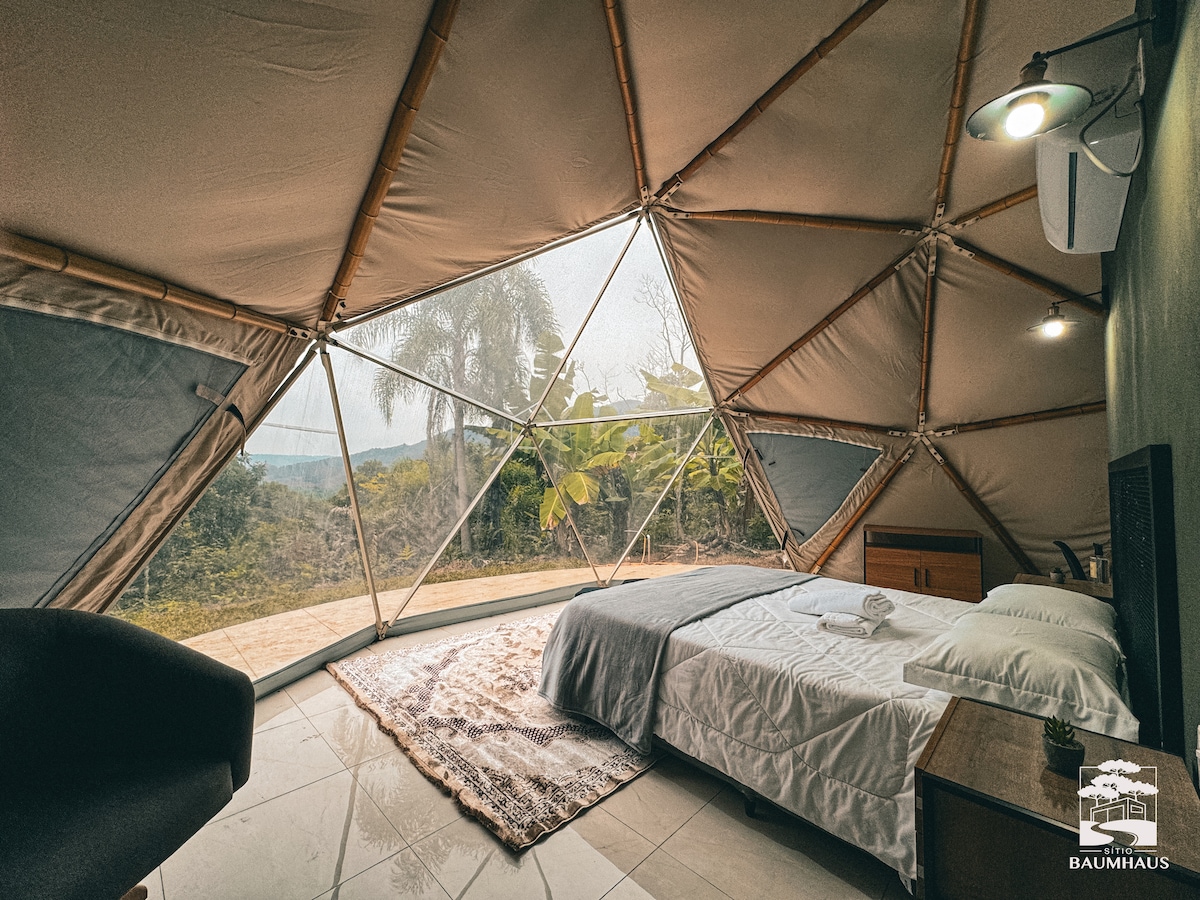 Refúgio romântico na Serra Gaúcha, em meio aos plátanos e ao silêncio da natureza. Um domo com arquitetura única, pensado para casais que buscam conforto, beleza e conexão. Viva uma experiência diferente, cercada por paisagens, céu estrelado e tranquilidade.