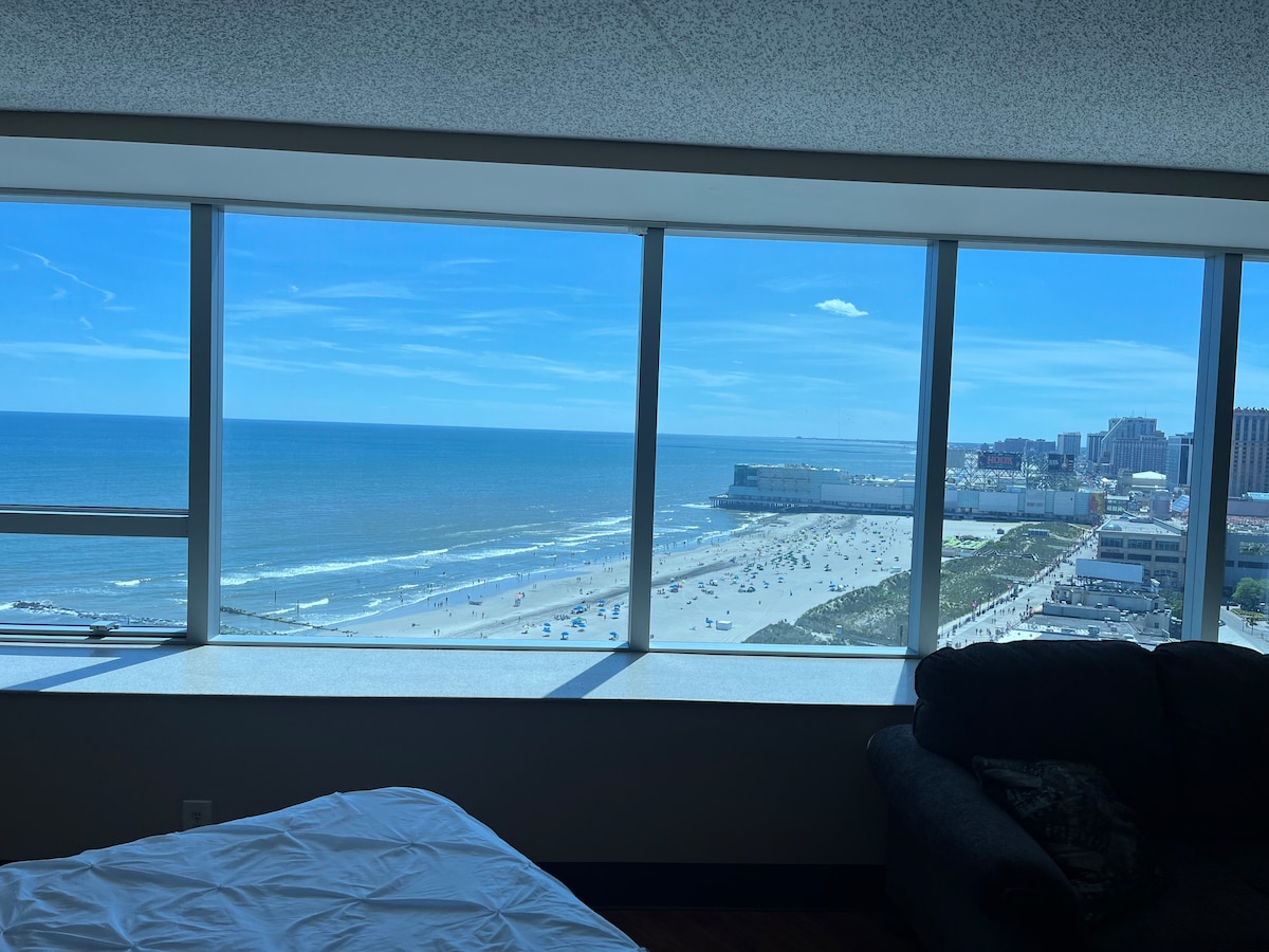 Finalmente! Meu apartamento de frente para o mar no 29º andar tem enormes janelas de ponta a ponta com vista para o mar e o calçadão. Saia pela porta da frente do meu prédio, diretamente para o calçadão! Vá para a esquerda ou para a direita e você está a poucos passos de cassinos, restaurantes e dos famosos cais! Ou pise nas praias de areia quente que esperam por você! Steel Pier fica nos arredores do nosso edifício (como... 15 passos!). Hard Rock, Casinos, Tropicana estão a 5 minutos a pé! Duas camas queen estão prontas para recebê-lo! :)