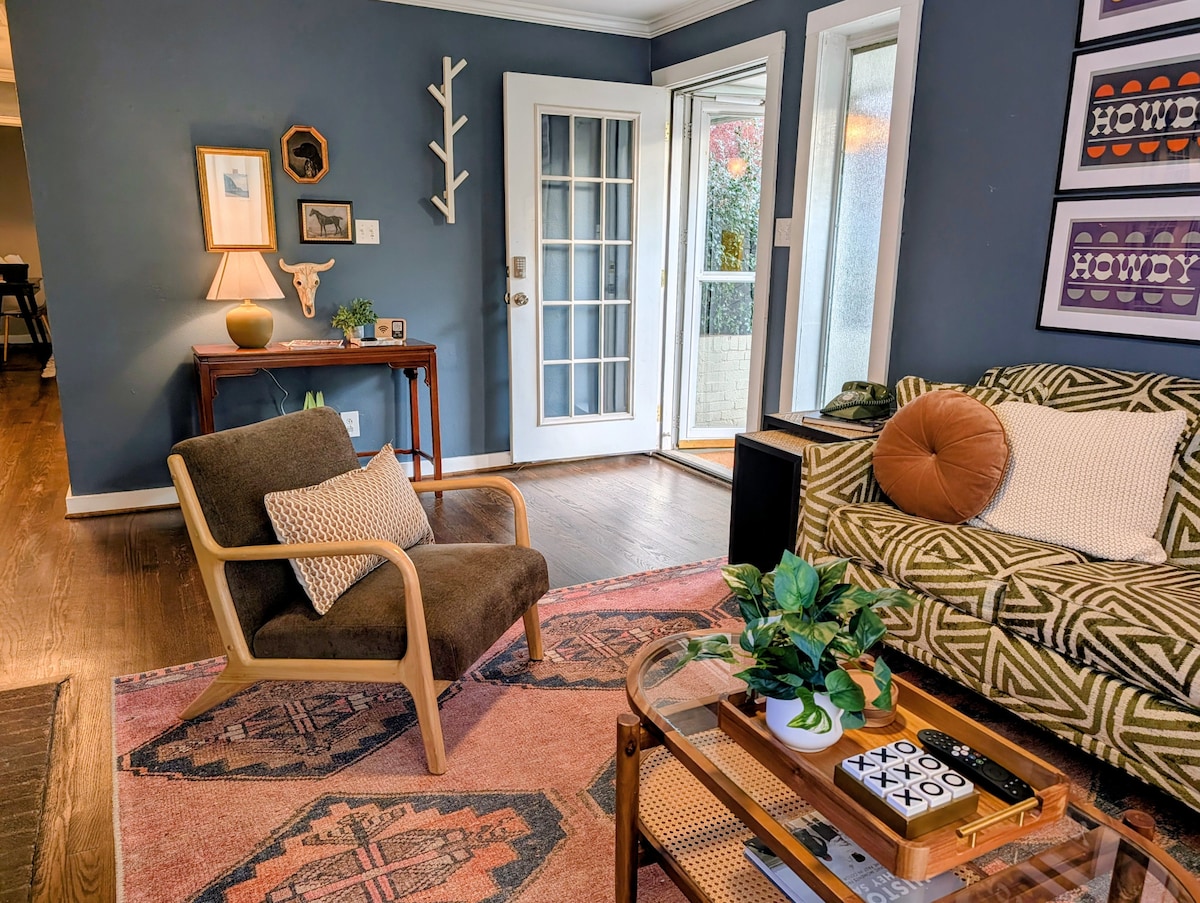 Bem-vindo a este retiro moderno de meados do século, perfeito para hóspedes exigentes que buscam conforto e luxo. Esta casa atualizada de conceito aberto 3QT, 2BA apresenta uma cozinha gourmet totalmente abastecida com ilha de quartzo, uma sala de estar aconchegante com lareira LED "Fogo & Gelo" e colchões orgânicos com lençóis finos. Relaxe no espaçoso deck com luzes de corda e vistas exuberantes para o jardim ou desfrute da rede e da churrasqueira a gás compartilhada. Situado em uma rua tranquila, este retiro é central para o aeroporto, South End, SouthPark e Uptown.