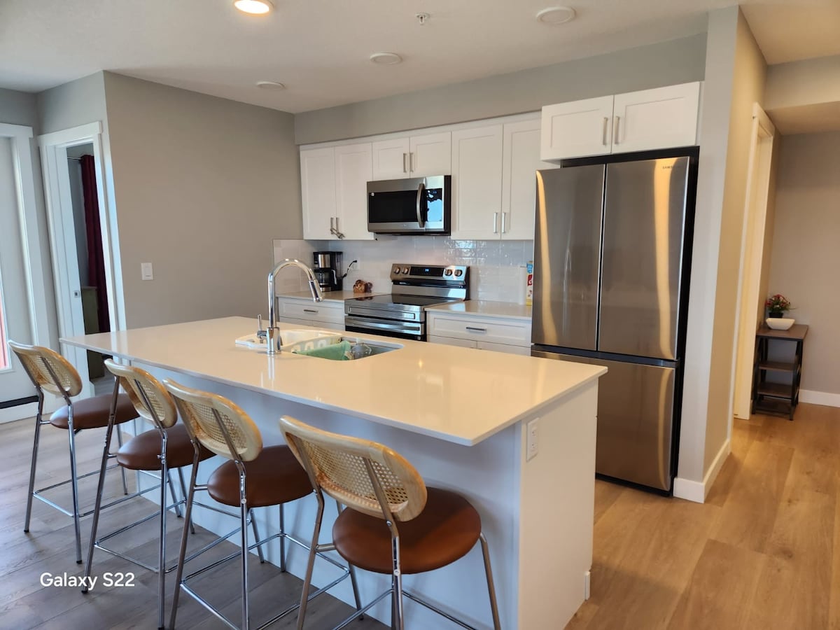Enjoy your stay in this pristine , spacious cozy basement suite located in one of Fort Saskatchewan’s newer developments. Close to grocery stores, community recreation center, walking paths and easy access to the highway. The suite offers all the amenities of home! All required cookware for meal prepping, an amazingly comfortable queen size bed, including black out blinds. Parking pad is available in the back beside the garage on or ample street parking out front.